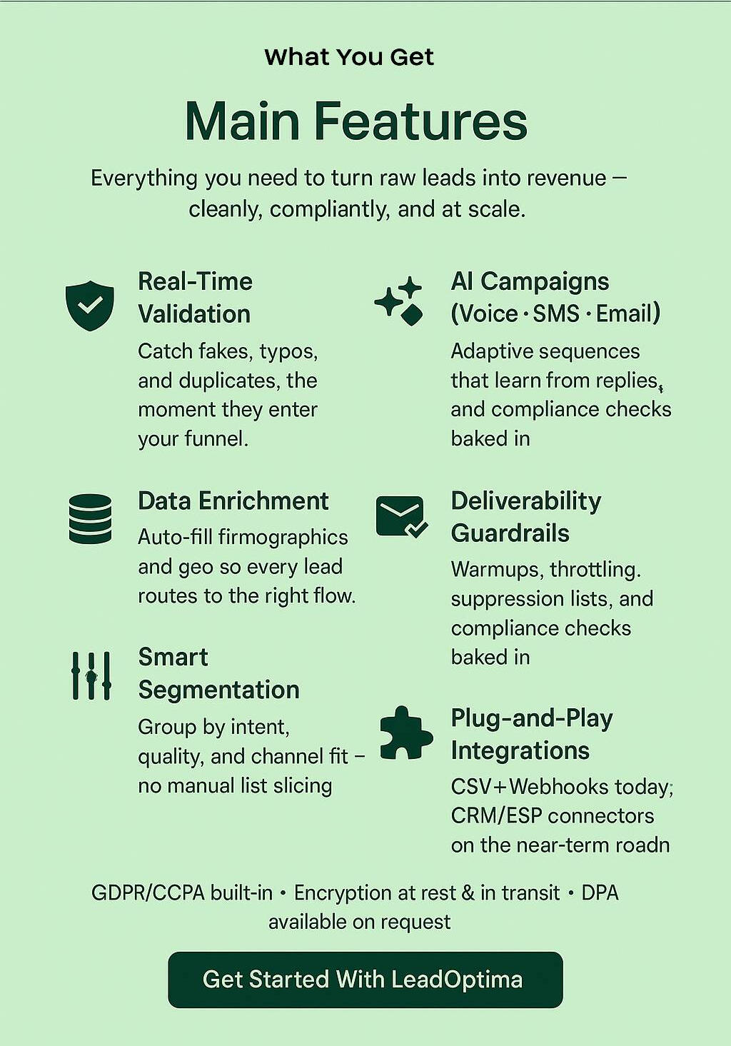 LeadOptima is a SaaS platform built for agencies, affiliate networks, and media companies that depend on lead quality. Our AI validates, enriches, and segments leads in real-time, ensuring you only work with verified and compliant data.Once validated, leads are activated through automated voice, SMS, and email campaigns — optimized for engagement and conversions. With built-in GDPR and CCPA compliance, you can scale confidently without legal risks.